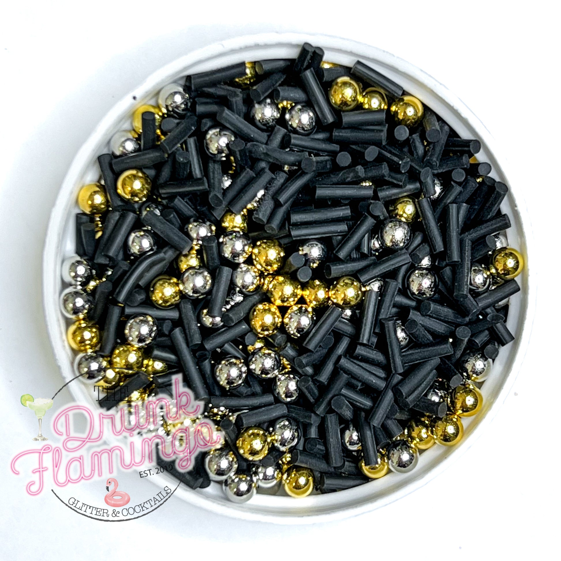 •custom mix of black sprinkles with gold and silver balls